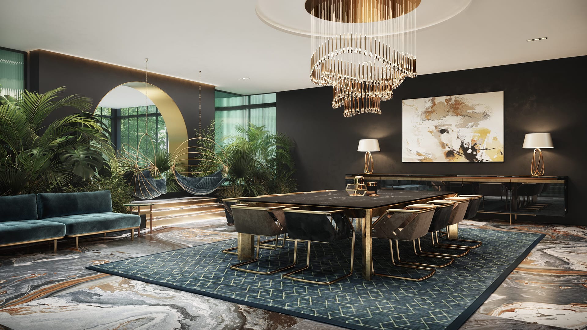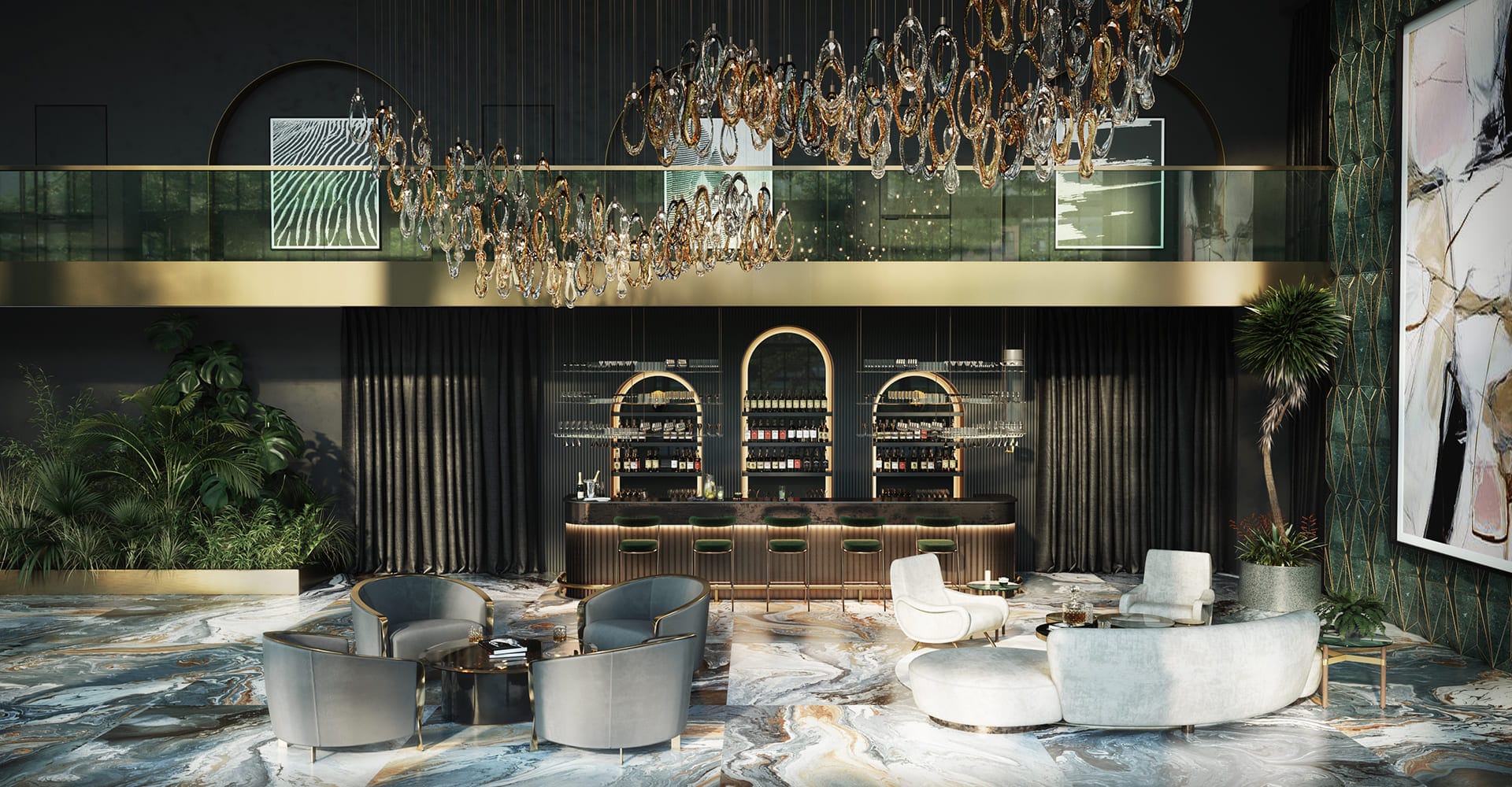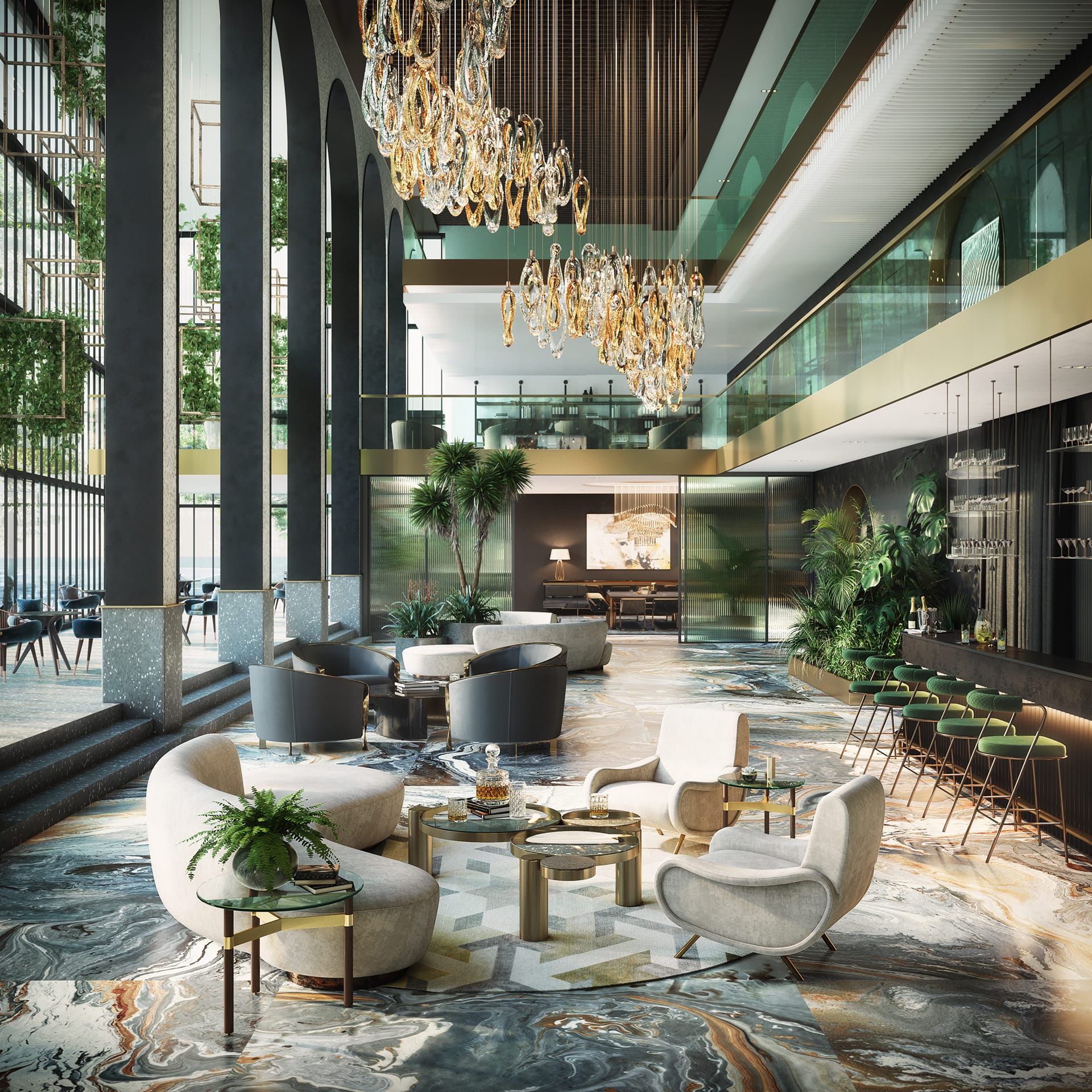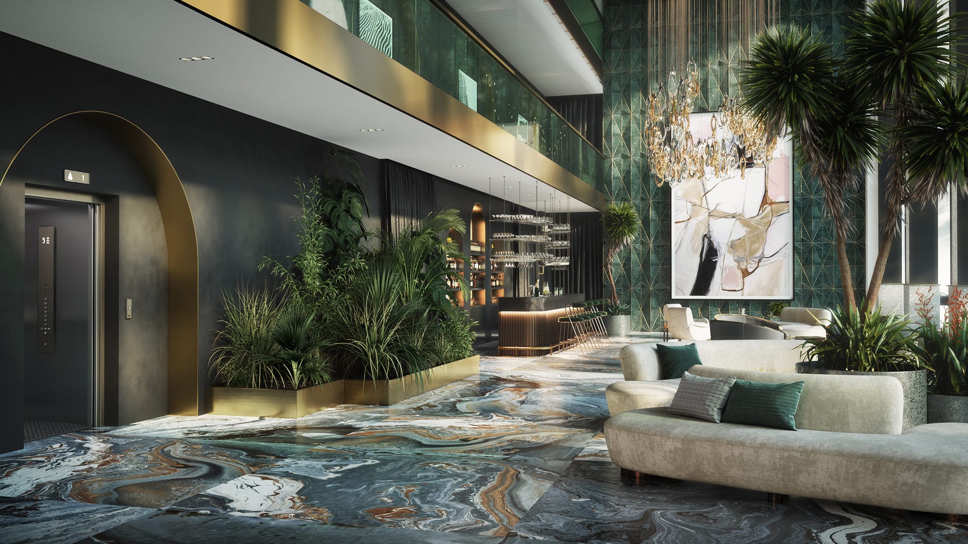 Set of visuals for The Burj Hall lobby concept in New York.